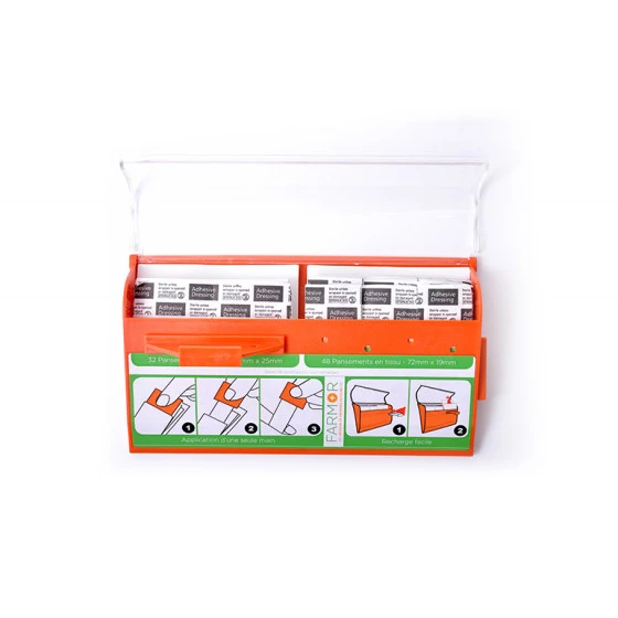 Muni d’un couvercle de protection transparent, permettant de protéger efficacement les pansements de la poussière et de l’humidité, son système de distribution permet de distribuer le pansement « prêt à l’emploi »