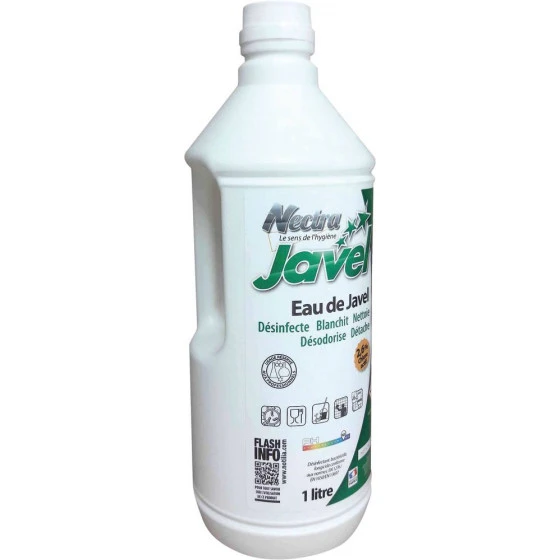 L’eau de javel 2.6% de chlore actif est une solution liquide jaunâtre à translucide. Elle désinfecte, détache, blanchit.
