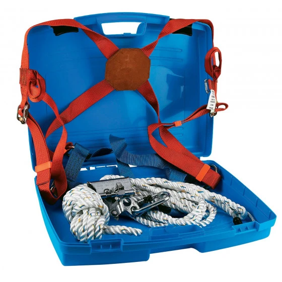 Réf. : Equipement de protection 3018EN 361 / EN 353-2 / EN 362Ensemble antichute comprenant un harnais réf. 450 avec 2 points d’accrochage, un antichute réf. 365, un cordage polyamide Ø 15 mm de 10 mètres réf. 15010 équipé d’un connecteur réf. 40, le tout dans une valise de rangement réf.115B. Ce kit Sécurité est utilsé dans le bâtiment pour les travaux mixtes.