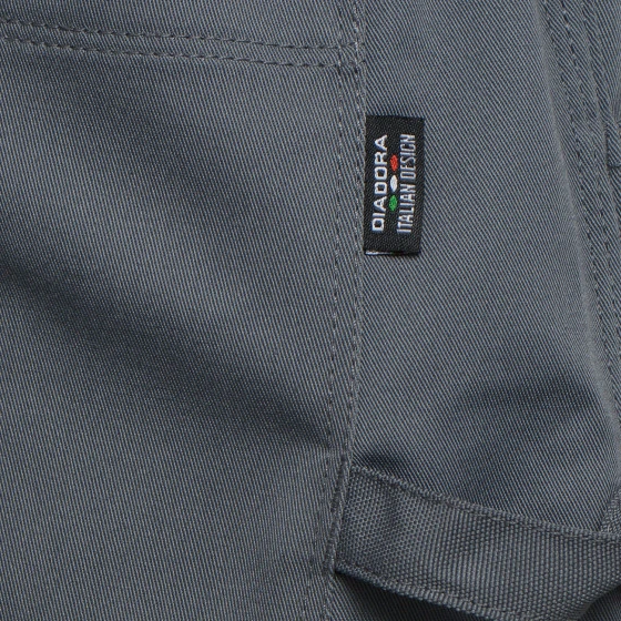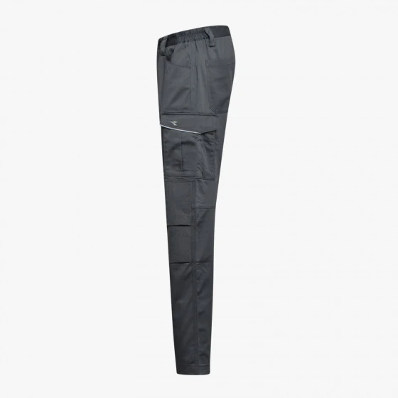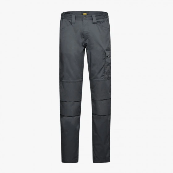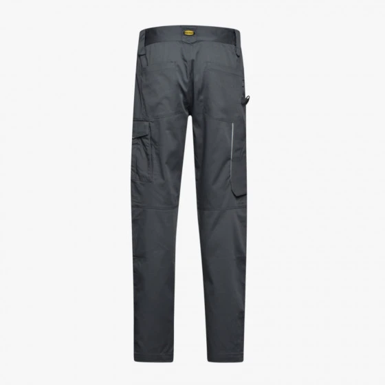 Pantalon en twill stretch de polyester, coton et élasthanne, avec poches porte-genouillères, poche latérale, détails réfléchissants, poche porte-mètre, porte-marteau, taille élastique, triple couture. contrastés en toile anti-abrasion.