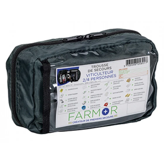 Trousse de secours spécial “Viticulteur” 2/4 personnes en tissu imperméable avec 2 sangles d’accroches ceinture et 12 pochettes de rangement intérieur. Fermeture par zip.