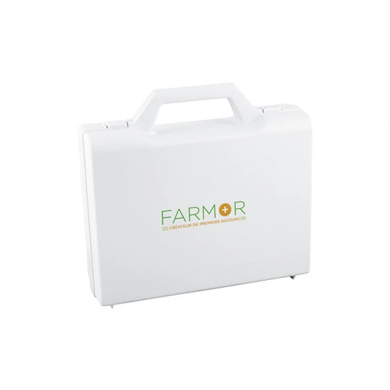 Caractéristiques : Valise de secours en polypropylène blanc, avec poignée de transport.
