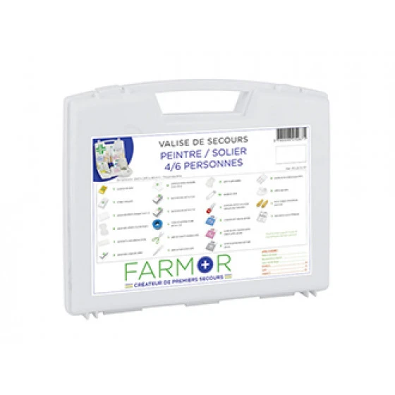 Valise de secours spécial “Peintre” 2/4 personnes en polypropylène blanc avec poignée de transport.